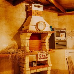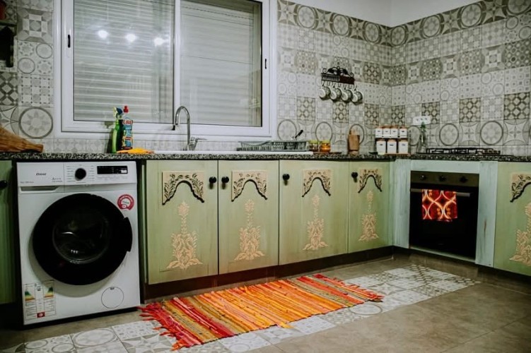 La cuisine entièrement équipée mêle charme artisanal et fonctionnalité contemporaine.