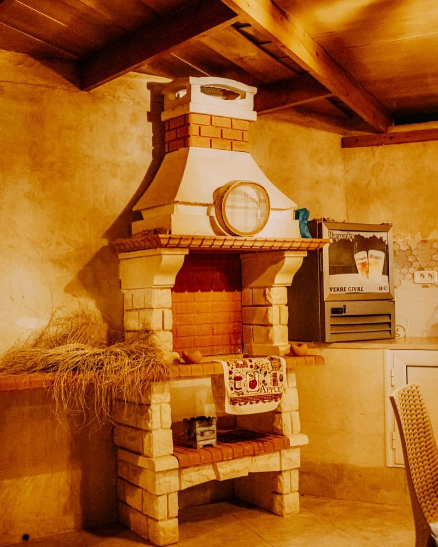 La cuisine entièrement équipée mêle charme artisanal et fonctionnalité contemporaine.