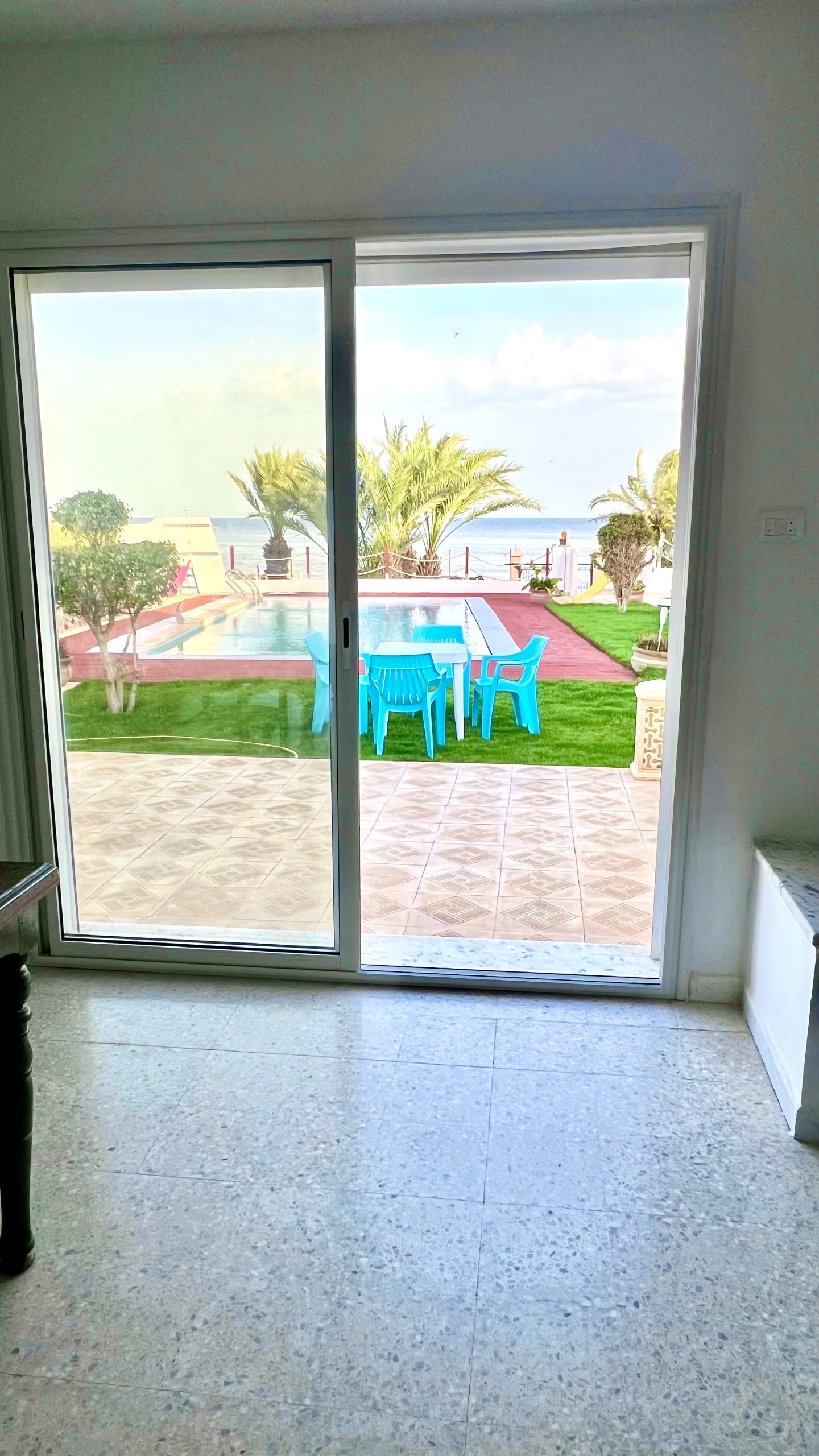 •Salon lumineux avec grandes baies vitrées donnant directement sur la mer